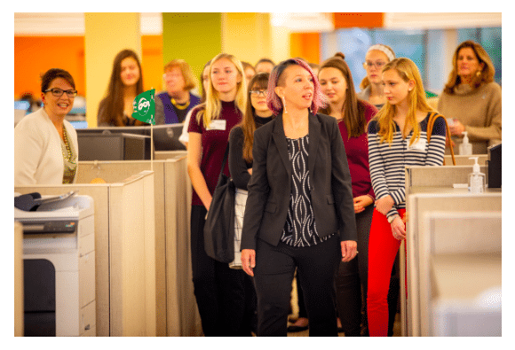 The students were warmly welcomed by Fidelity Investments executives. They started the day hearing about Fidelity Investment’s internal initiatives to get more women into financial fields and then were whisked off to division tours and department huddles.